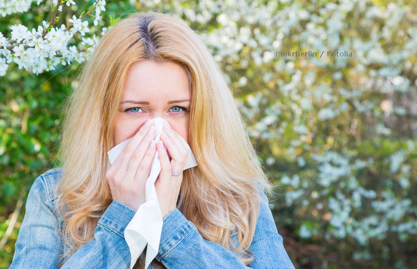 Eine blonde Frau, die im Freien steht und ein Taschentuch an ihre Nase hält, als ob sie niest oder sich die Nase putzt. Im Hintergrund sind blühende Bäume zu sehen.